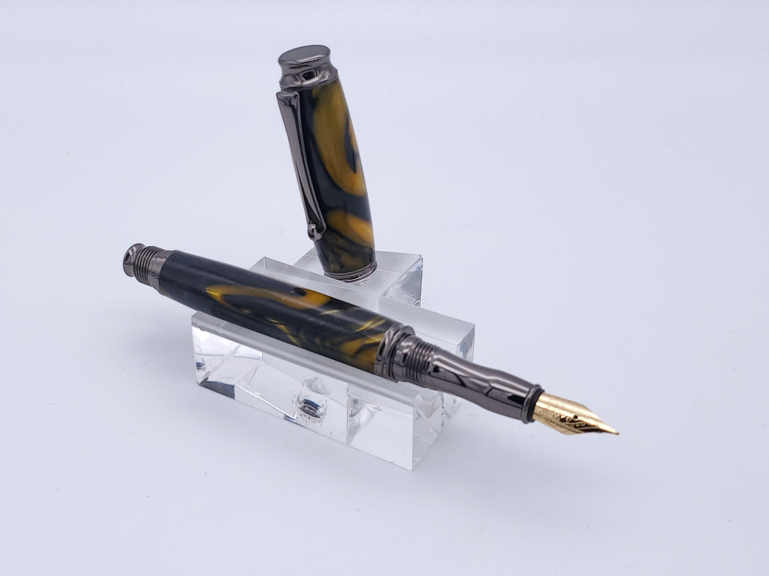 This exquisite pen is made with custom poured acrylic resin in multiple shades of black & yellow. With a sleek design and a gun metal finish, this pen is sure to impress.