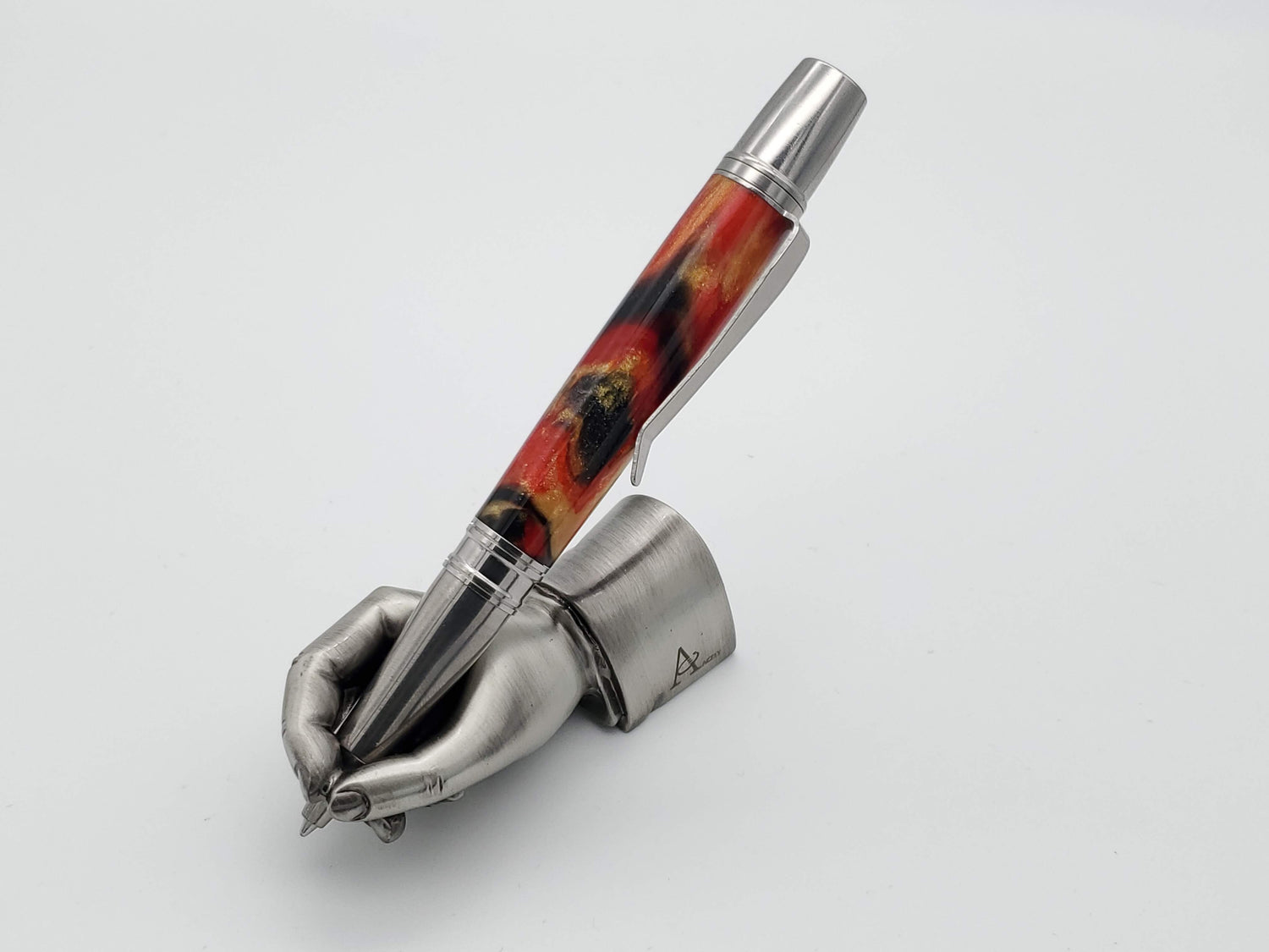 As the artist and designer of this pen, each handcrafted pen is a unique one of a kind item, meticulously handcrafted to the highest standards. Each pen goes through a careful process of selecting just the right materials to accentuate the hardware, then through a multi-stage preparation and building process, and finally it is finished and buffed to a high-gloss shine that will keep it looking great for years.