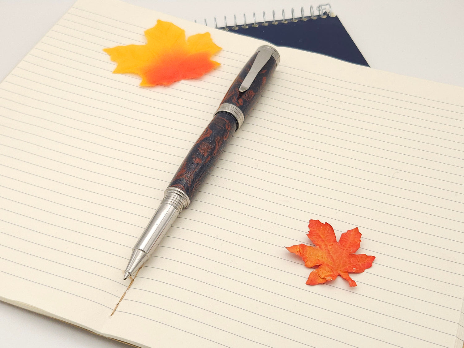 As the artist and designer of this pen, each handcrafted pen is a unique one of a kind item, meticulously handcrafted to the highest standards. Each pen goes through a careful process of selecting just the right materials to accentuate the hardware, then through a multi-stage preparation and building process, and finally it is finished and buffed to a high-gloss shine that will keep it looking great for years.