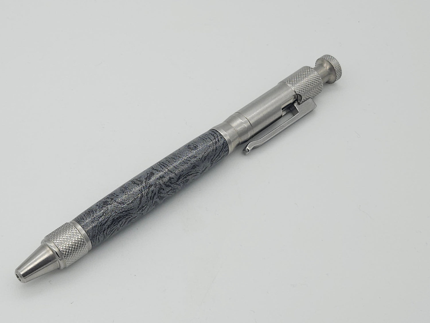 A unique writing experience with a unique pen! This pen is made from solid stainless steel and has a unique clip with a bolt action to extend and retract the ink. It features a tactical knurled grip and is an excellent pen for EDC.