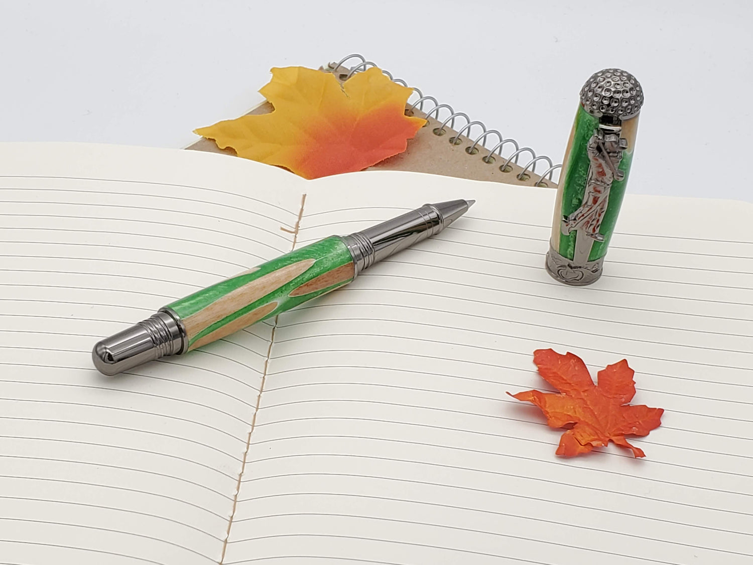 This exquisite pen is made with real golf tees cast in multiple shades of green resin! Paired with a gun metal finish, the design of the pen includes images of putting greens around the center band, a golfer in full swing as the clip, and the top finial resembles a golf ball. The cap is threaded and posts securely for writing and storing. You'll love the smooth writing feel of a rollerball pen. It has the feel of using a fountain pen with the ease of a ballpoint.
