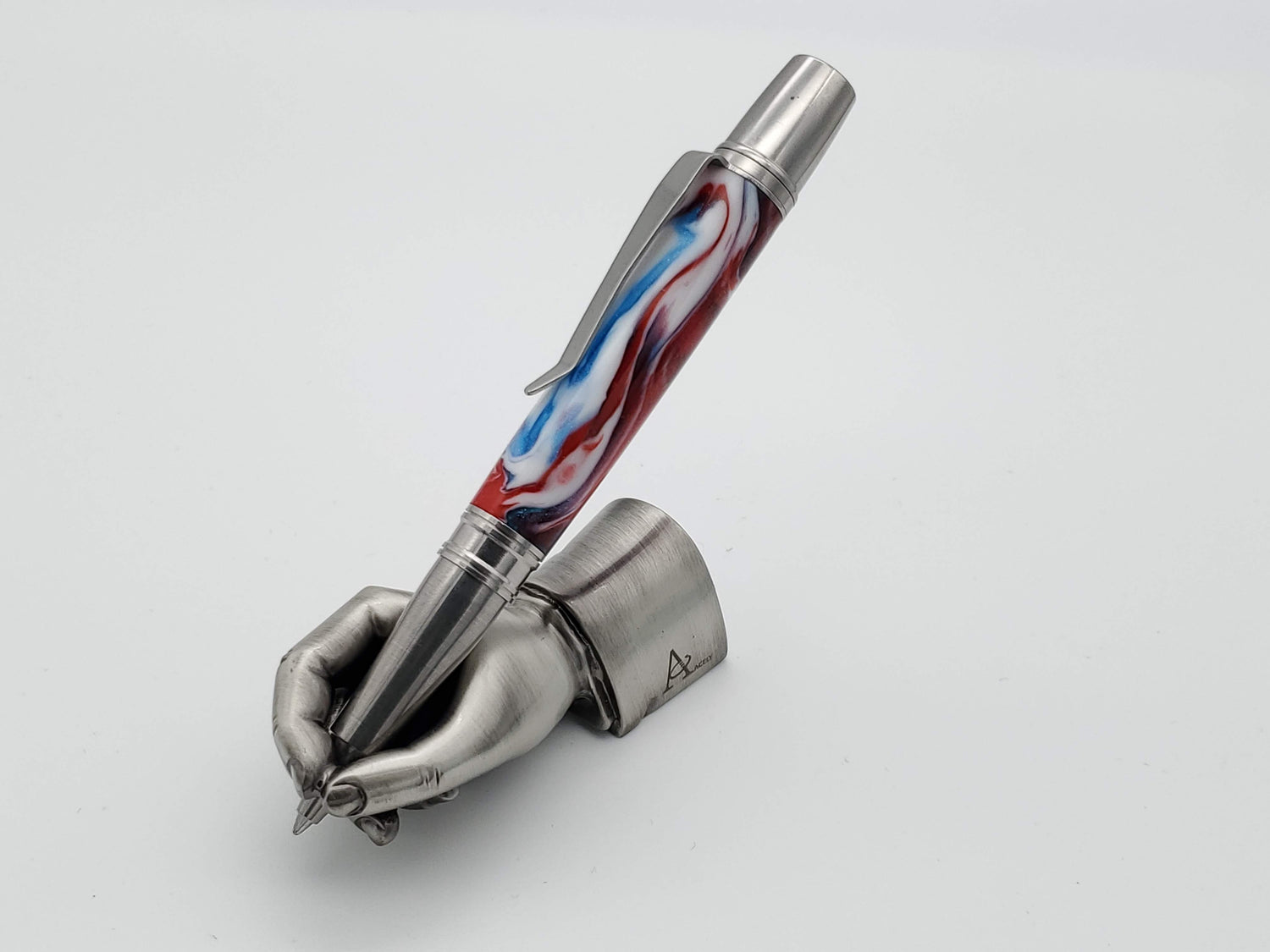 As the artist and designer of this pen, each handcrafted pen is a unique one of a kind item, meticulously handcrafted to the highest standards. Each pen goes through a careful process of selecting just the right materials to accentuate the hardware, then through a multi-stage preparation and building process, and finally it is finished and buffed to a high-gloss shine that will keep it looking great for years.