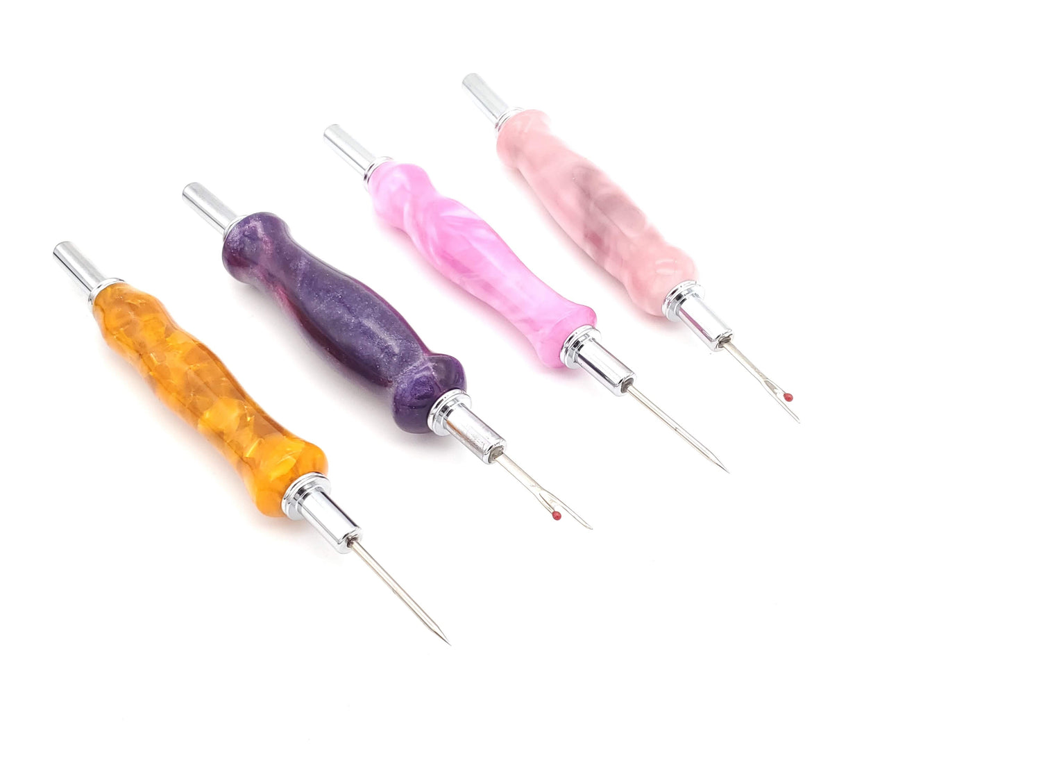 These unique handles are handcrafted from solid acrylic and turned on the lathe. One end features a small seam ripper that quickly cuts through stiches on a sewing project, and the other end features a stiletto/tailor's awl, useful for precisely manipulating fabric or feeding small swatches through the sewing machine. Both blades are made from sharp, durable manganese steel, and are easily reversible for storage inside the handle.
