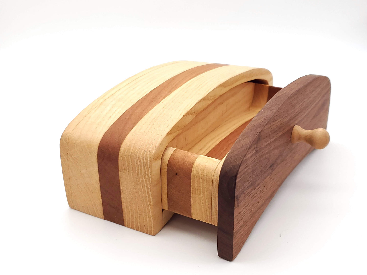 This beautiful jewelry box is habdcrafted from walnut, ash, & cherry hardwoods.  It was carved out of a solid box on the bandsaw which gives an amazing effect of the different wood species throughout the entire piece.