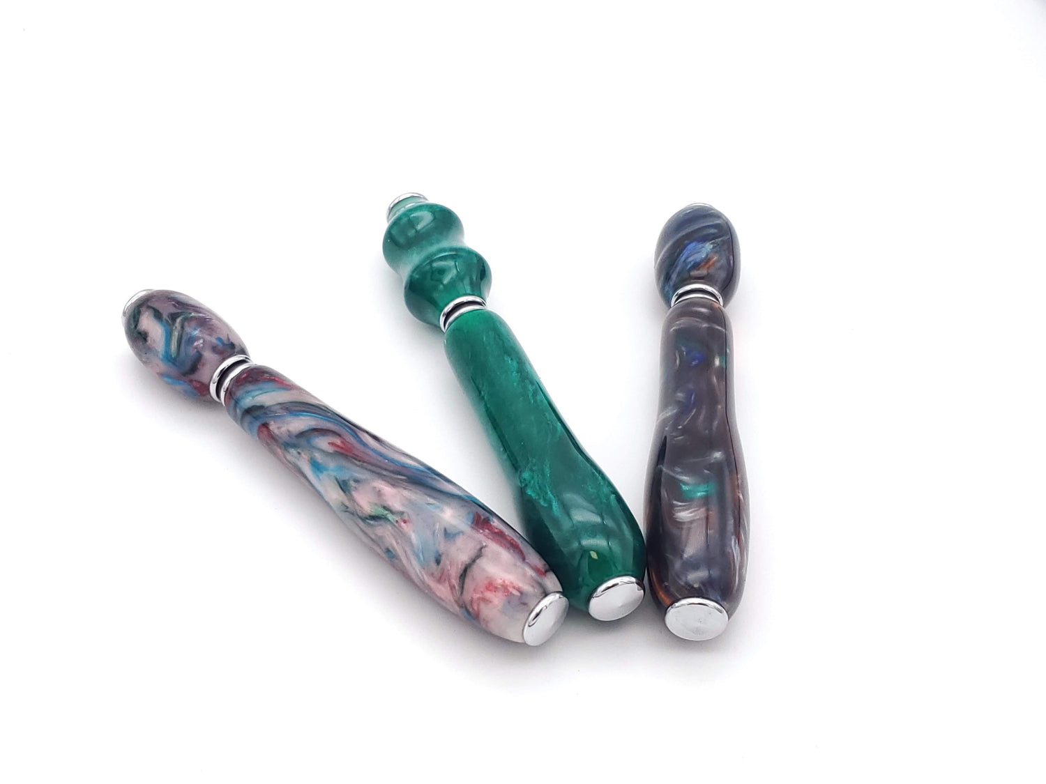 As the artist and designer of this pen, each handcrafted pen is a unique one of a kind item, meticulously handcrafted to the highest standards. Each pen goes through a careful process of selecting just the right materials to accentuate the hardware, then through a multi-stage preparation and building process, and finally it is finished and buffed to a high-gloss shine that will keep it looking great for years.