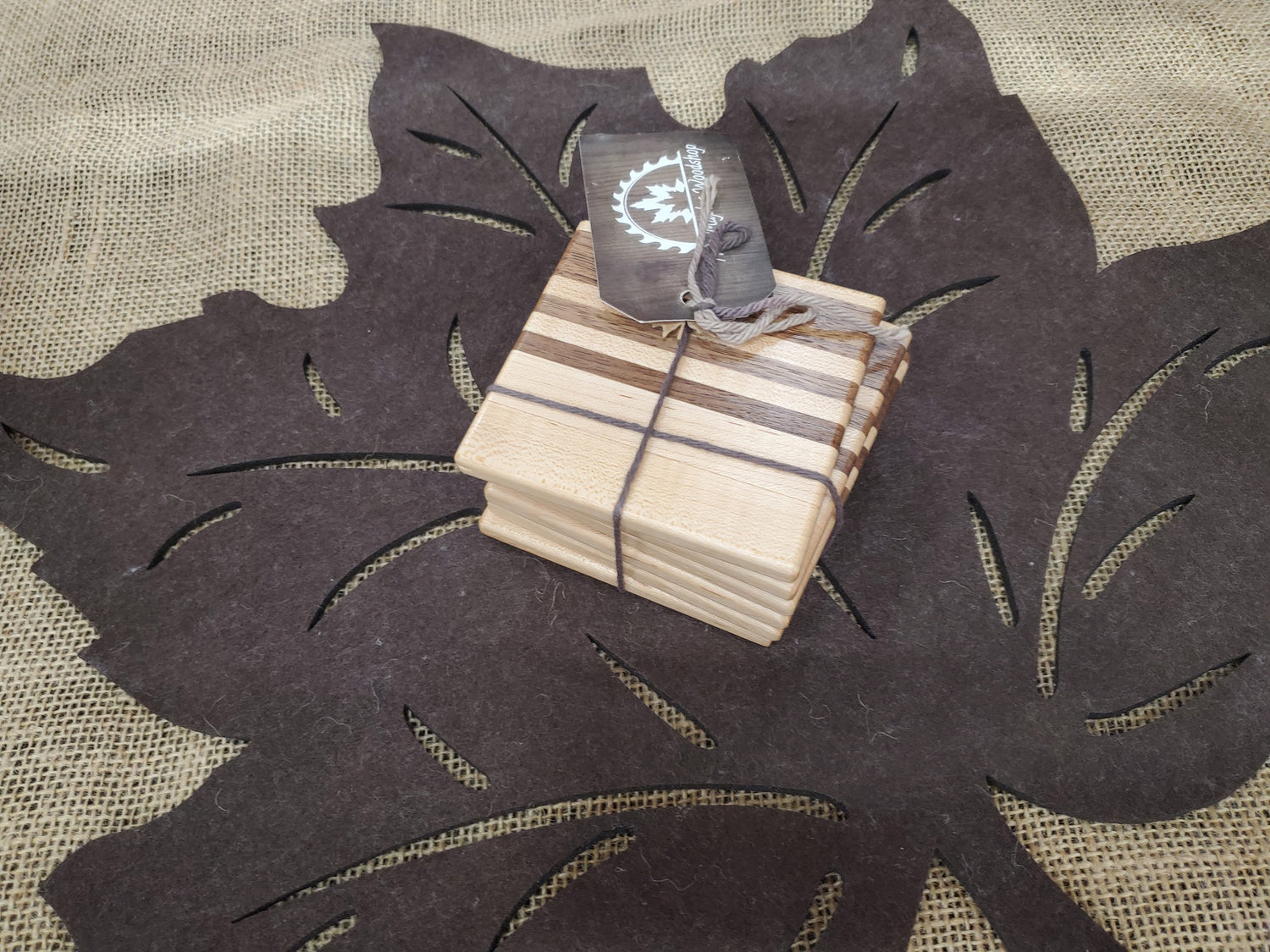 Handcrafted set of 6 coasters. Made from hardwoods.