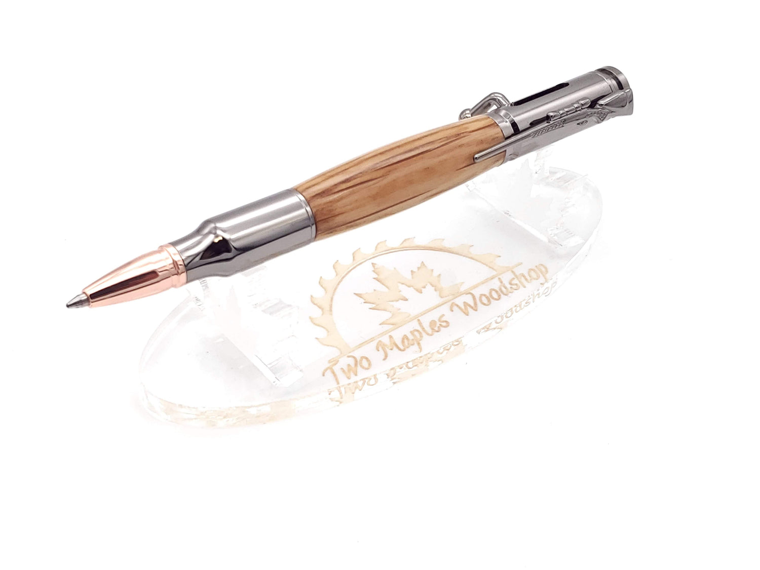 This exquisite pen is made with certified authentic wood from a Jack Daniels whiskey barrel, and comes with the COA. The Oak wook looks great paired with a gun metal finish on the bolt action 30 caliber pen hardware along with copper tip and primer for a realistic look.