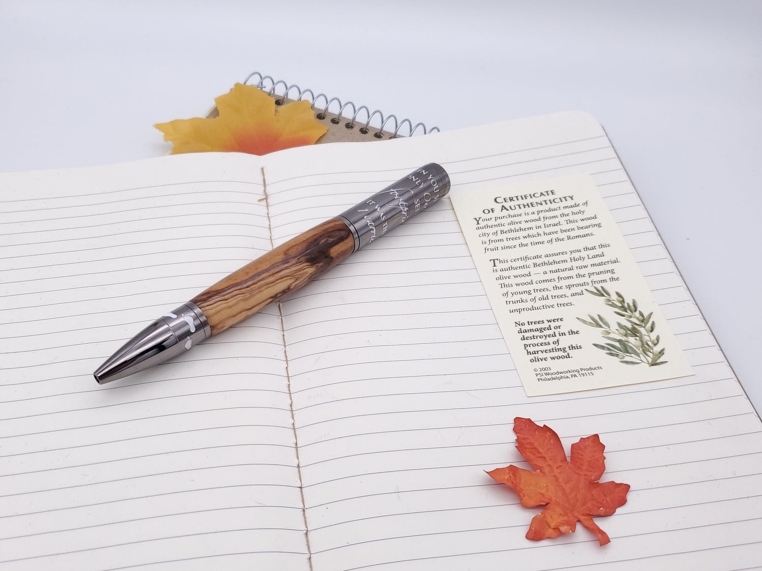 This exquisite pen is made with olivewood imported from the holy land. The Bethlehem Olivewood has an exquisite grain figure and comes with a certificate of authenticity, and is paired with a gun metal finish.