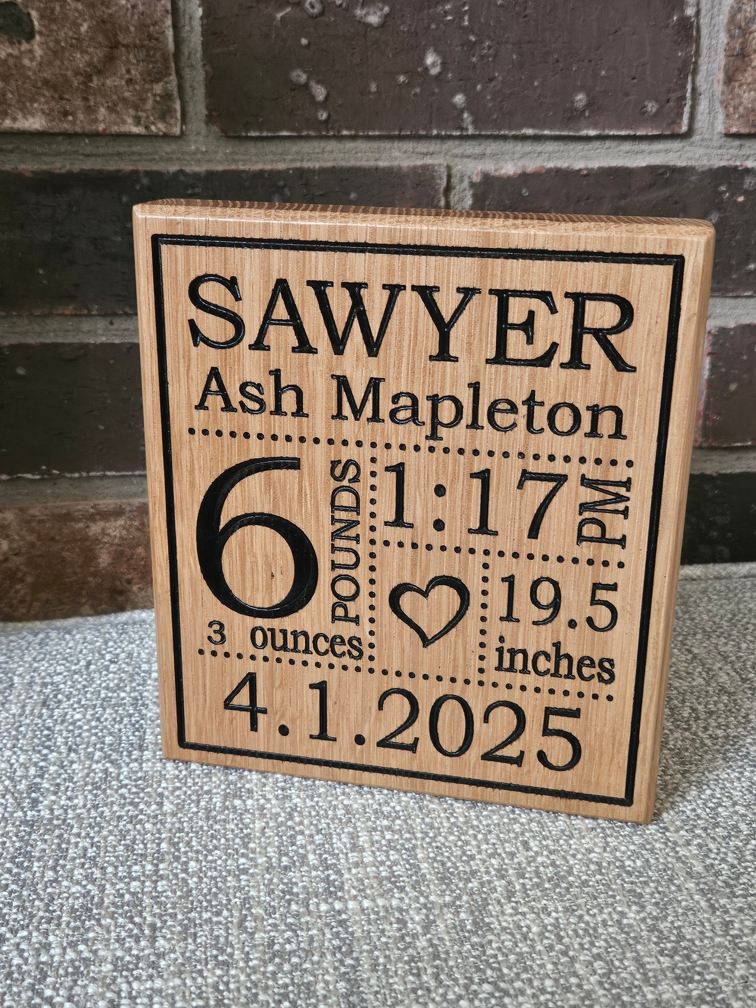 Celebrate your little one’s arrival with a handcrafted keepsake as timeless as the moment itself. Each Birth Announcement Baby Stat Sign is custom-made to showcase the meaningful details of your baby's birth—name, date, time, weight, and length—all beautifully engraved into premium solid white oak hardwood.