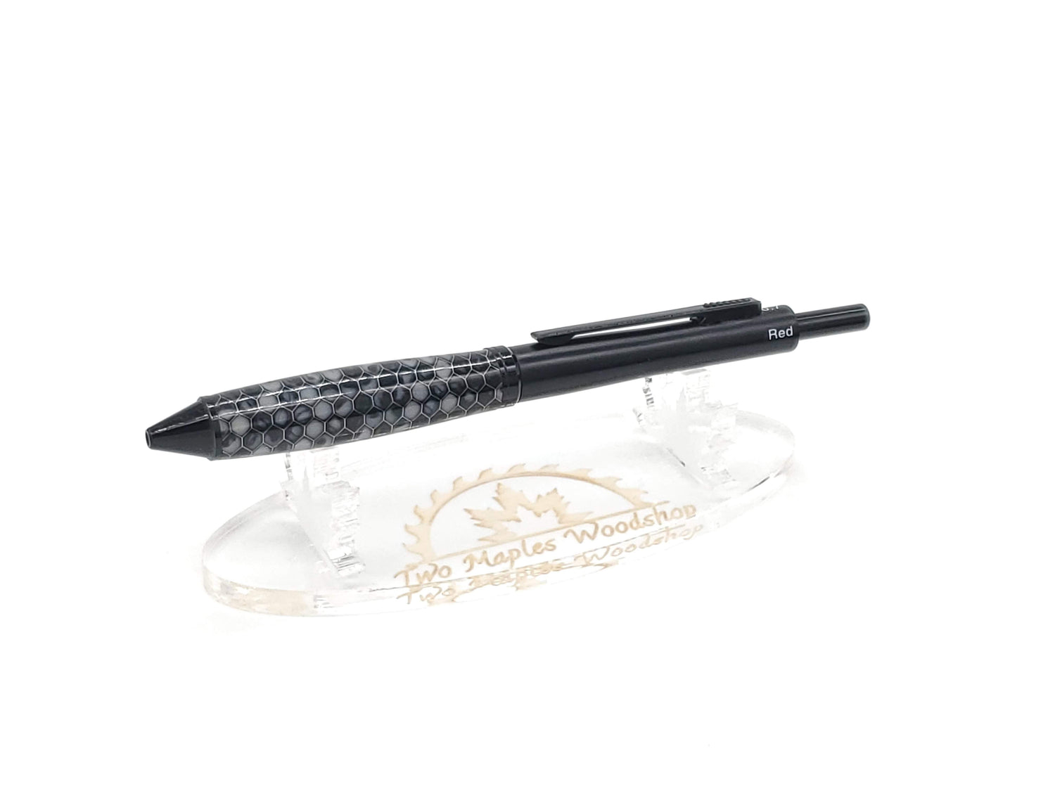 This exquisite pen is made with black & gray acrylic resin that is poured over aluminum honeycomb, and is paired with a matte black finish on the hardware. It features a 4-way gravity feed mechanism that has red, blue, and black ink as well as a 0.7mm lead pencil. The one facing up when you click the pen is what gets extended, and pushing the button on the clip will retract the ink or pencil.