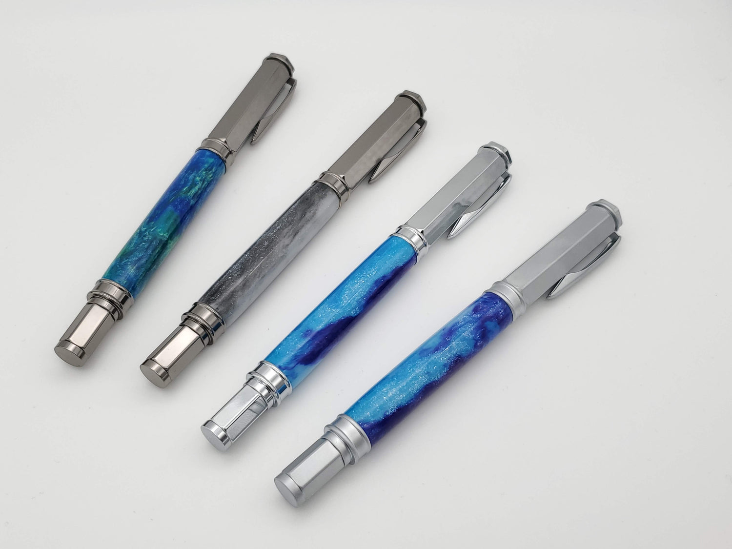 As the artist and designer of this pen, each handcrafted pen is a unique one of a kind item, meticulously handcrafted to the highest standards.  Each pen goes through a careful process of selecting just the right materials to accentuate the hardware, then through a multi-stage preparation and building process, and finally it is finished and buffed to a high-gloss shine that will keep it looking great for years.