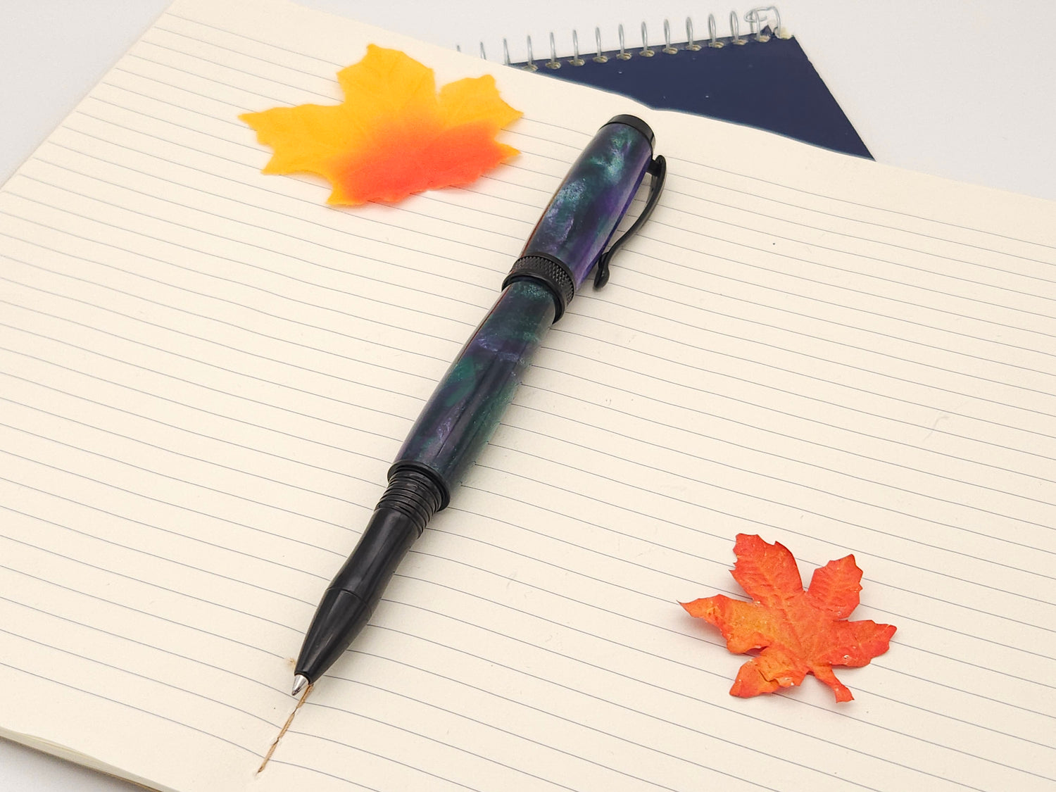 As the artist and designer of this pen, each handcrafted pen is a unique one of a kind item, meticulously handcrafted to the highest standards. Each pen goes through a careful process of selecting just the right materials to accentuate the hardware, then through a multi-stage preparation and building process, and finally it is finished and buffed to a high-gloss shine that will keep it looking great for years.