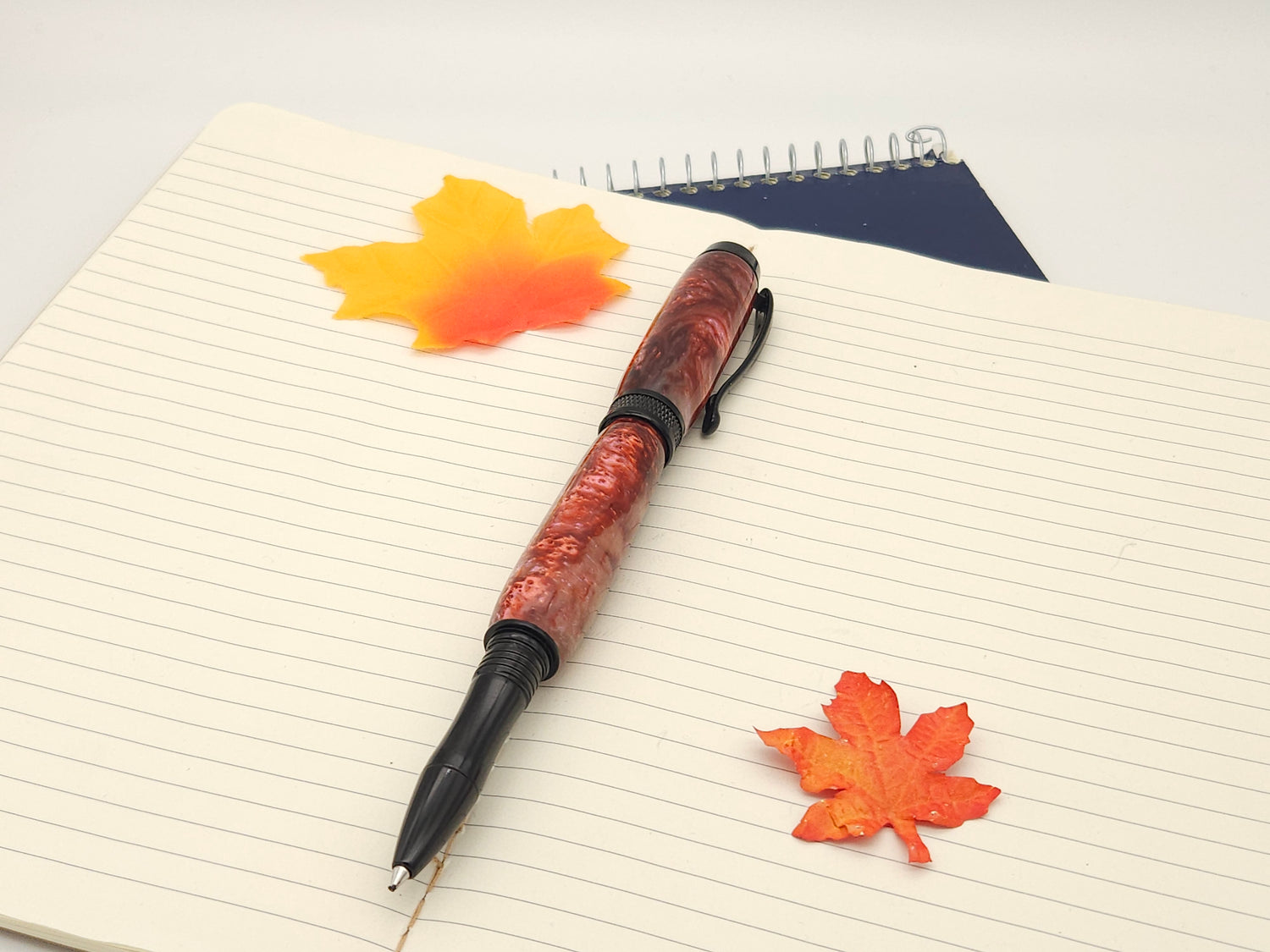 As the artist and designer of this pen, each handcrafted pen is a unique one of a kind item, meticulously handcrafted to the highest standards. Each pen goes through a careful process of selecting just the right materials to accentuate the hardware, then through a multi-stage preparation and building process, and finally it is finished and buffed to a high-gloss shine that will keep it looking great for years.