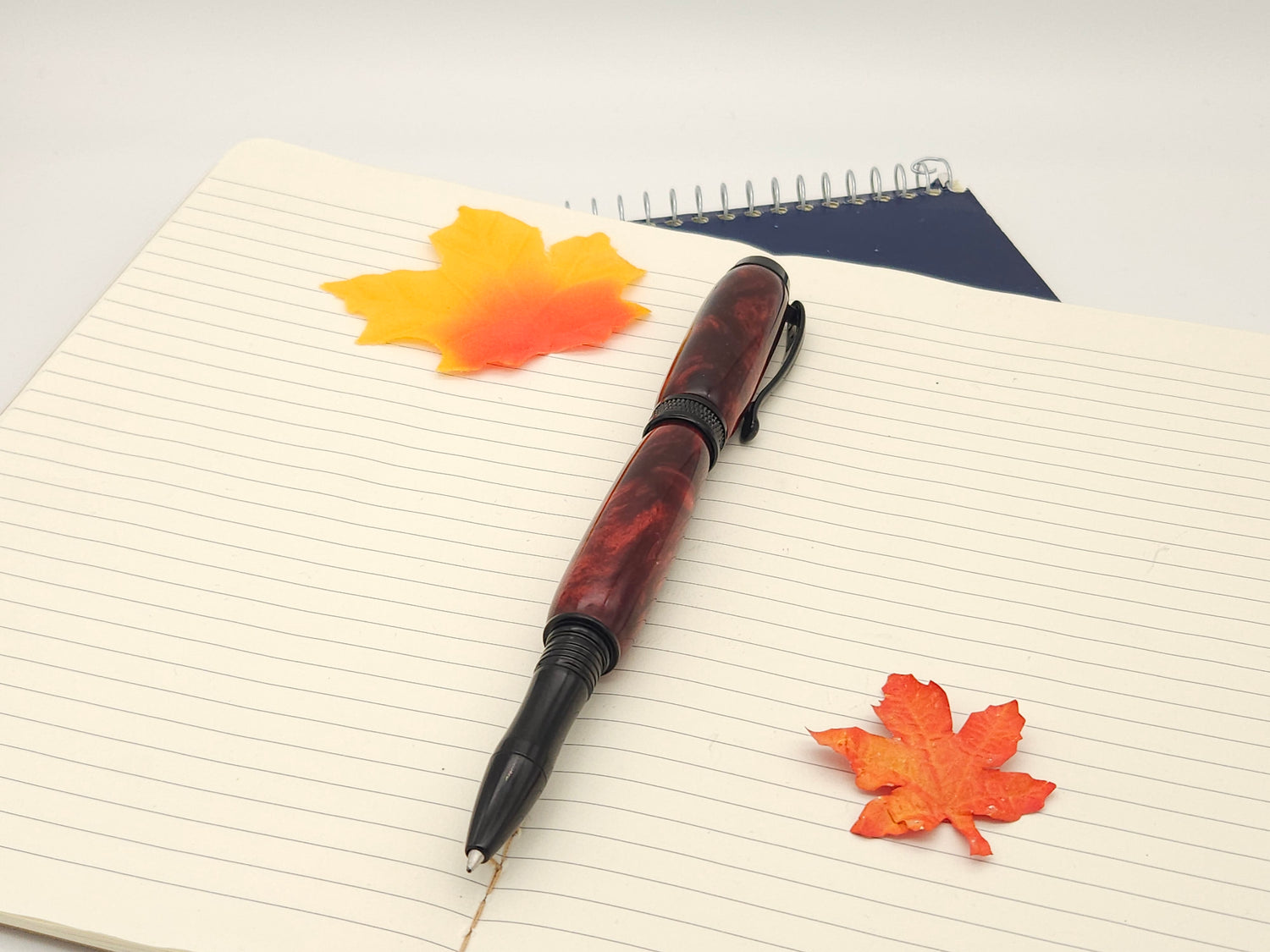 As the artist and designer of this pen, each handcrafted pen is a unique one of a kind item, meticulously handcrafted to the highest standards. Each pen goes through a careful process of selecting just the right materials to accentuate the hardware, then through a multi-stage preparation and building process, and finally it is finished and buffed to a high-gloss shine that will keep it looking great for years.